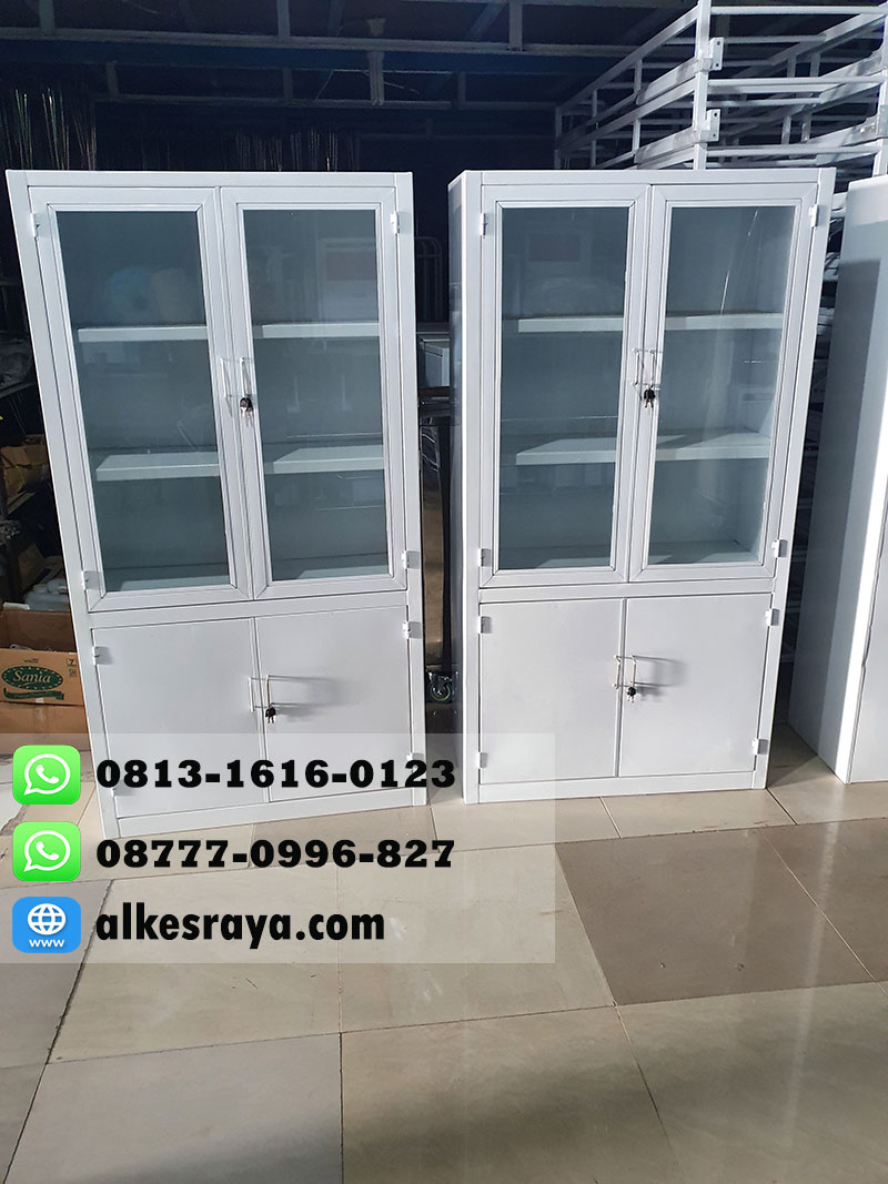 Lemari Obat 2 dan 1 bahan Besi & Stainless Lokal – untuk Rumah Sakit,Klinik,Puskesmas,uks untuk penyimpanan obat dan lainnya. Dimensi atau ukuran untuk lemari obat 2 pintu besi : Dimensi (PxLxT)