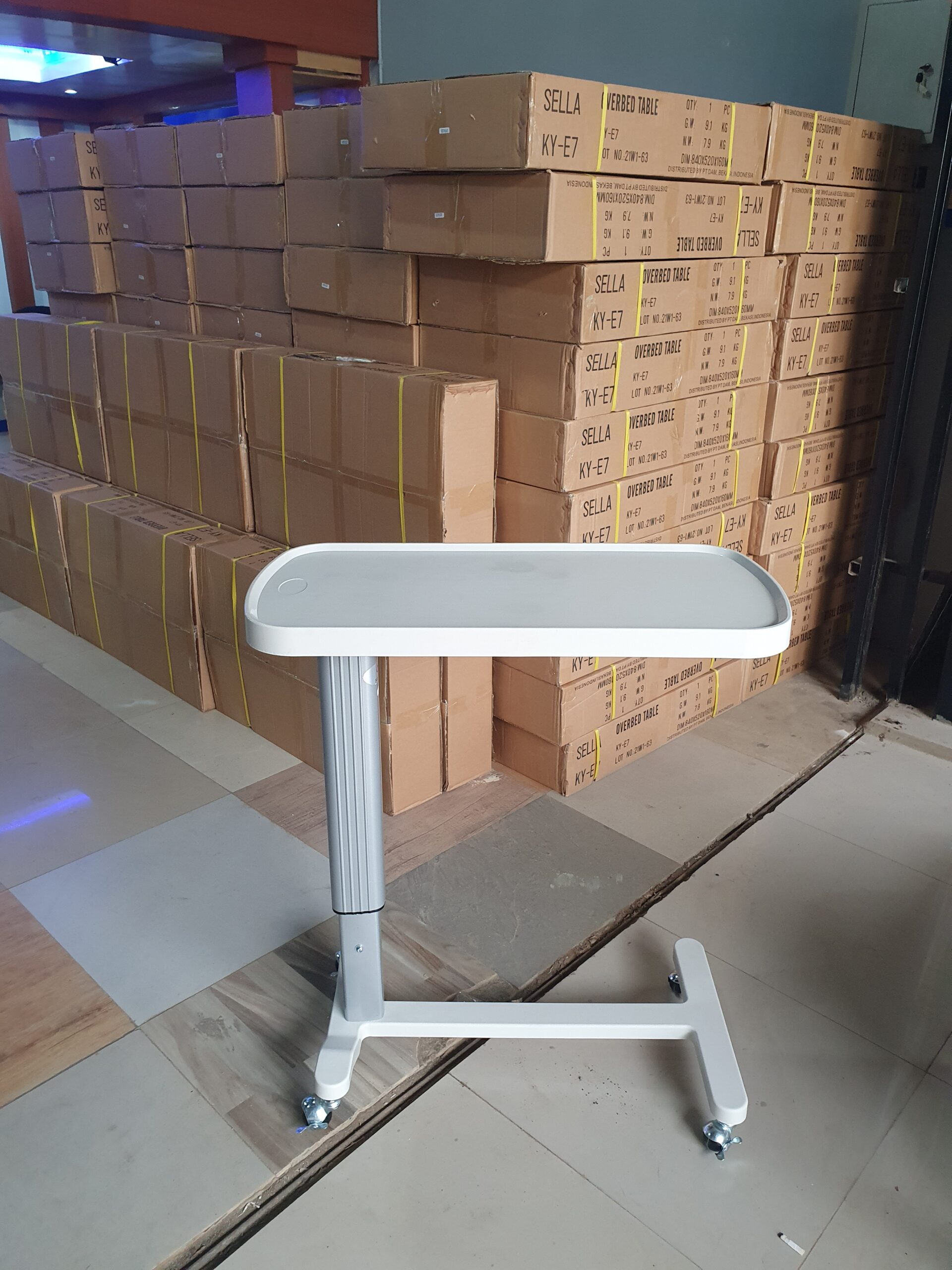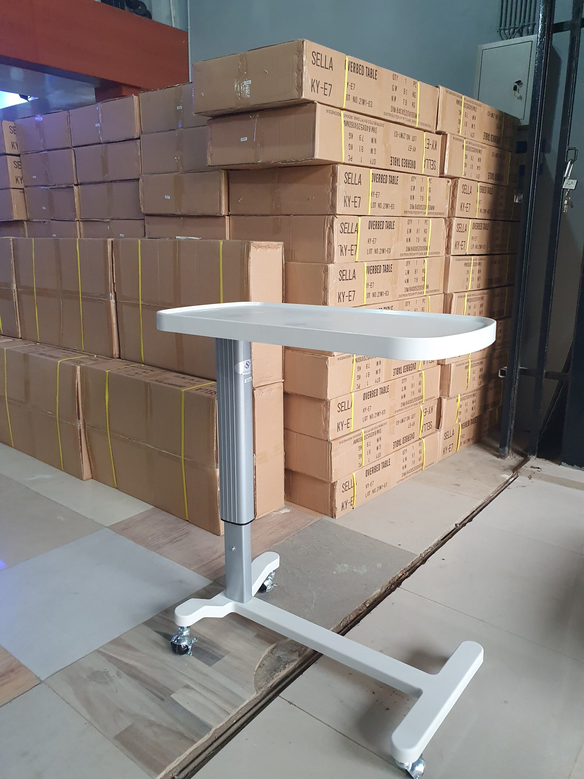 Overtable ABS bed hospital/rumah sakit atau Meja mayo untuk tempat makan pasien berbahan abs dan alumunium bisa di naik turunkan sesuai kebutuhan. Merk Sella